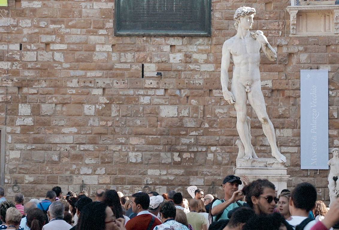 The David was sculpted by a very young Michelangelo (in his twenties) entirely from a single block of local Carrara marble and it's 5.17 metres tall (17 ft). It represents the biblical hero David that killed Goliath and when it was unveiled, in 1504, it soon came to symbolize the defense of the civil liberties embodied in the Florentine Republic.