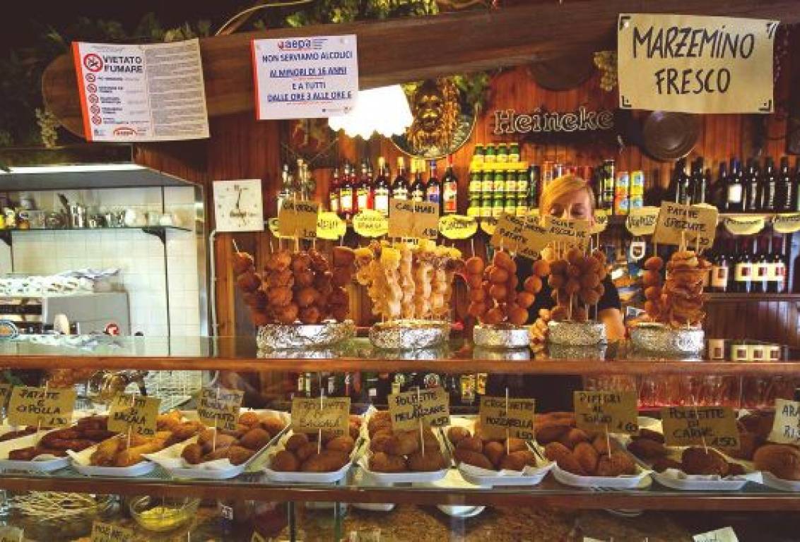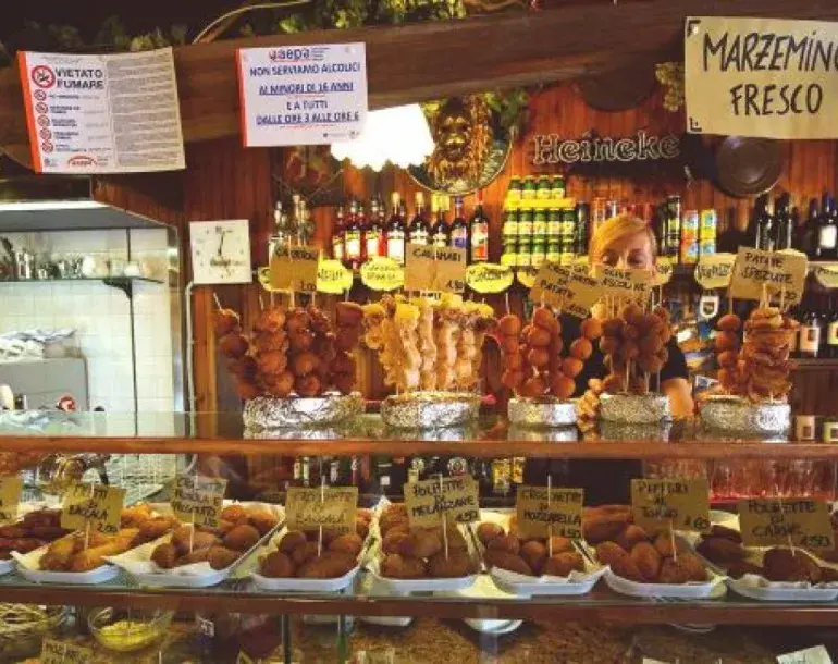 Take a few breaks along the way to step into the charming little joints and cafès, for a drink and taste of traditional fare: the famous Venetian cicchetti, typical “tapas-like” morsels and snacks made with fresh local products!